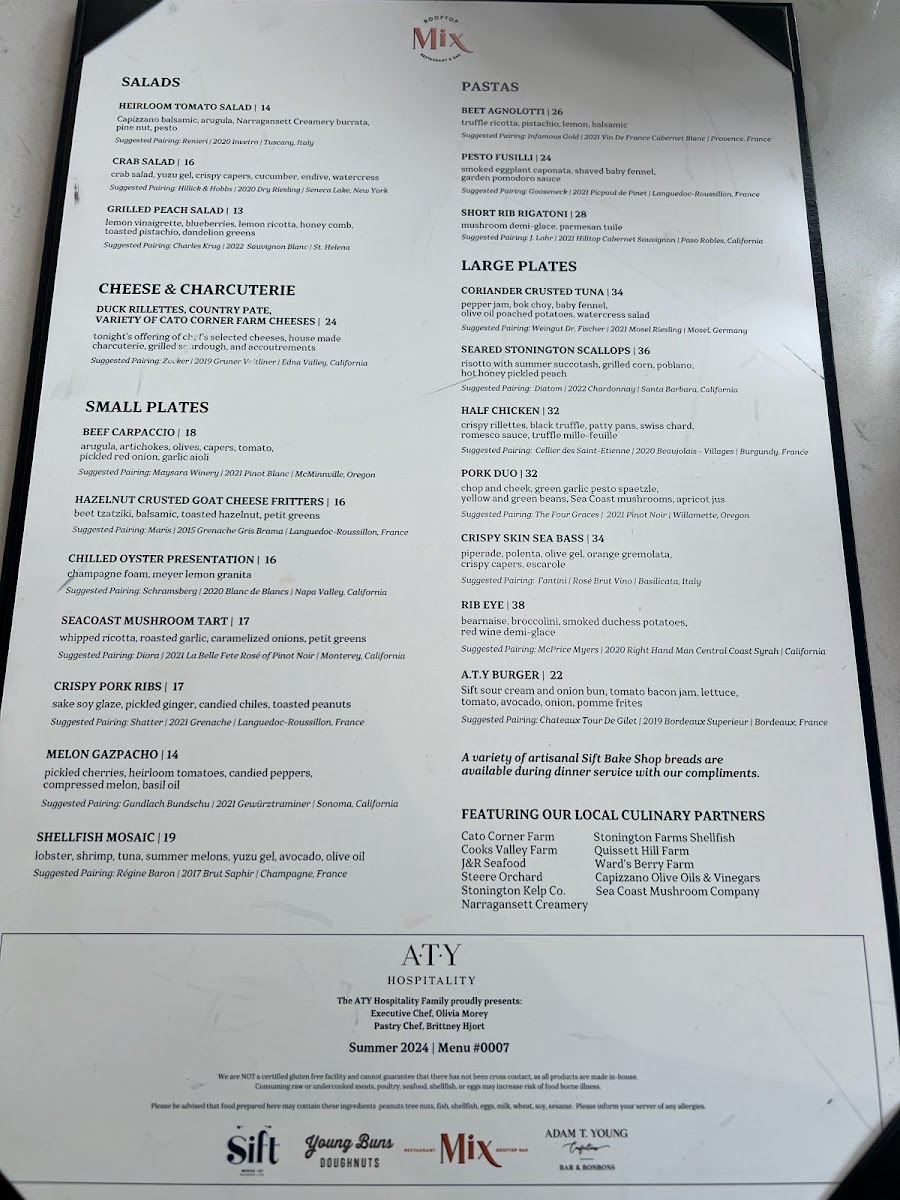 The menu at Mix is a delightful journey, showcasing expertly crafted dishes. Begin with a refreshing Crab Salad or a succulent Heirloom Tomato Salad. For the main course, indulge in the Pork Duo or the exquisite Seared Stonington Scallops, each pairing bold flavors with artistic presentation. Pastas like the Short Rib Rigatoni offer comforting elegance and depth.